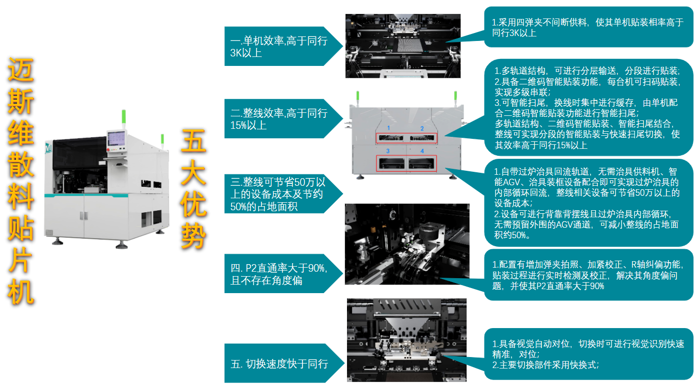 可實(shí)現(xiàn)1212及以上散料燈珠,間距P1.5及以上LED燈板的不間斷貼裝要求,單軌雙供料系統(tǒng),貼裝效率可達(dá)60K以上