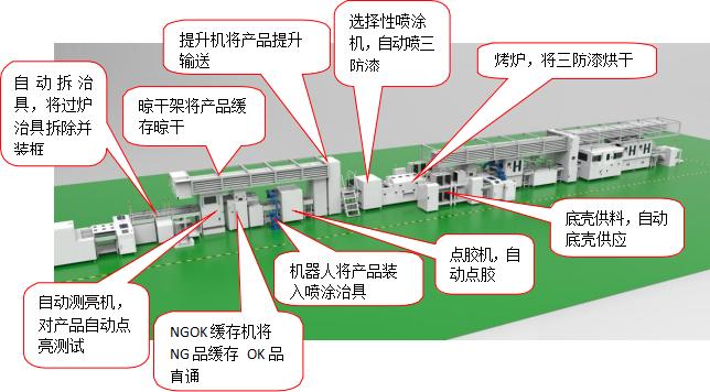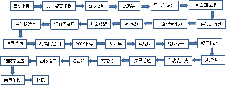 LED 顯示屏模組戶外生產(chǎn)線,可分為:SMT 工段、裝配工段,其中 SMT 工段又分為:IC 段、燈面段, 裝配段可細(xì)分為:噴涂點(diǎn)膠段、底殼裝配段、灌膠段、面罩裝配段。